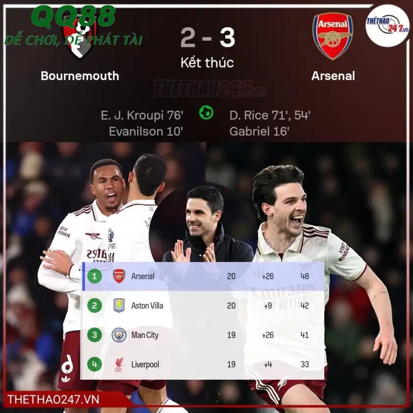Chiến thắng kịch tính 3-2 trước Bournemouth không chỉ giúp Arsenal duy trì khoảng cách an toàn với các đối thủ bám đuổi mà còn tiếp thêm nguồn động lực to lớn cho chặng đường còn lại của mùa giải. Với một đội hình trẻ trung, khát khao và giờ đây có thêm một thủ lĩnh đích thực ở tuyến giữa như Declan Rice, người hâm mộ Arsenal hoàn toàn có quyền mơ về một cái kết ngọt ngào sau nhiều năm chờ đợi.